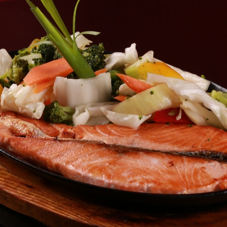 Grelhado na chapa com legumes, molho a base de shoyo e saquê, gohan e missô.