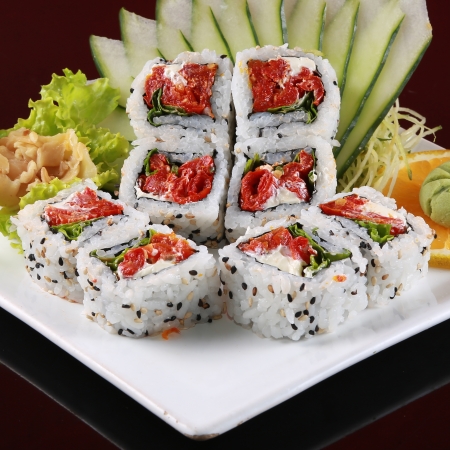 Sushi de alga por dentro e arroz por fora com tomate seco, rĂșcula e cream cheese.  (8 unidades)