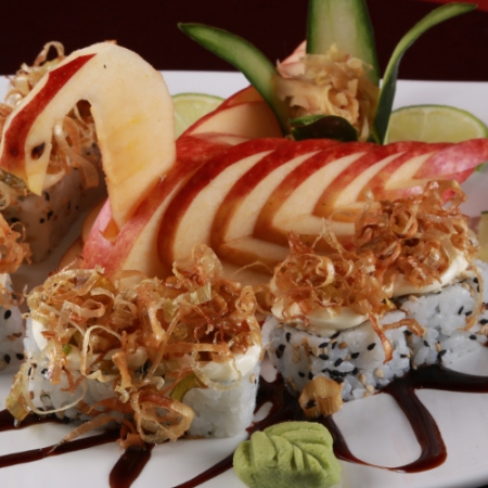 Sushi de alga por dentro e arroz por fora com peixe empanado com alho porĂ³ frito.  (8 unidades)