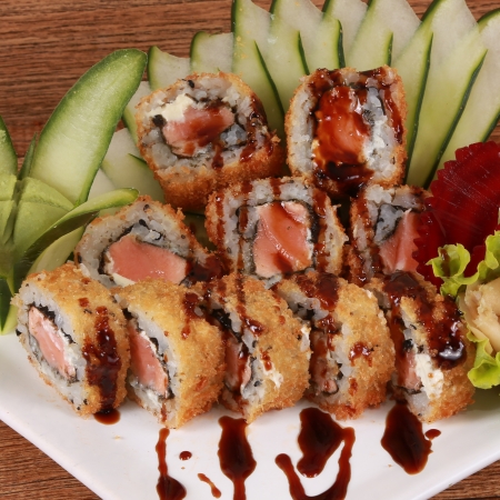 Sushi de arroz empanado ao contrário, recheado com salmão e cream cheese. (10 unidades)